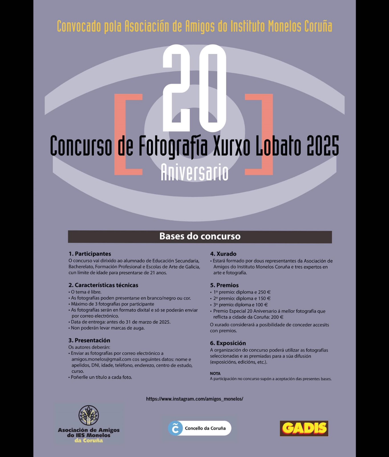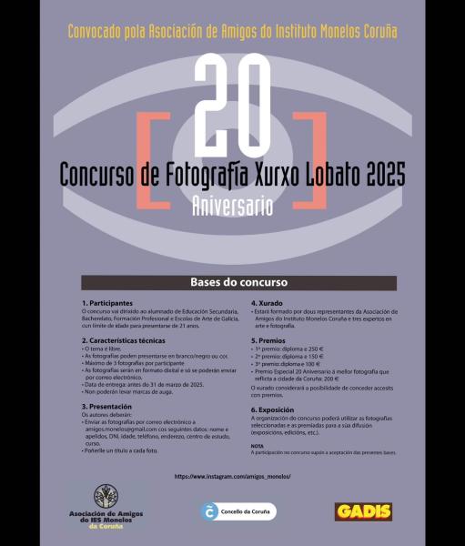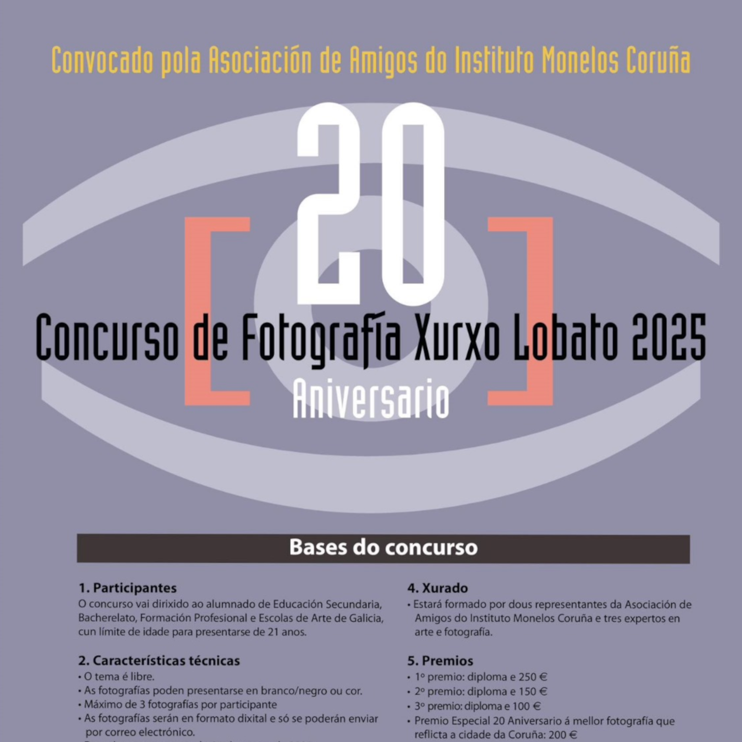 La Asociación de Amigos del Instituto Monelos Coruña presenta la 20 edición del Concurso de Fotografía Xurxo Lobato, dirigido al alumnado de Educación Secundaria, Bachillerato, Formación Profesional y Escuelas de Arte de Galicia, con un límite de edad para presentarse de 21 años.
