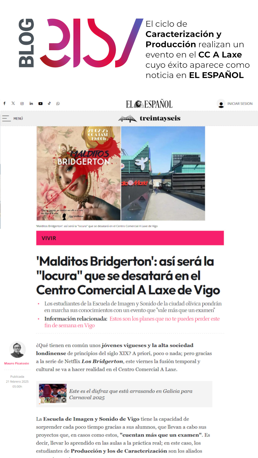 El evento realizado por l@s alumn@s de Caracterización y Producción "Los Malditos Bridgerton" celebrado el pasado Viernes 21 en el Centro Comercial de A Laxe aparece como noticia en EL ESPAÑOL.
